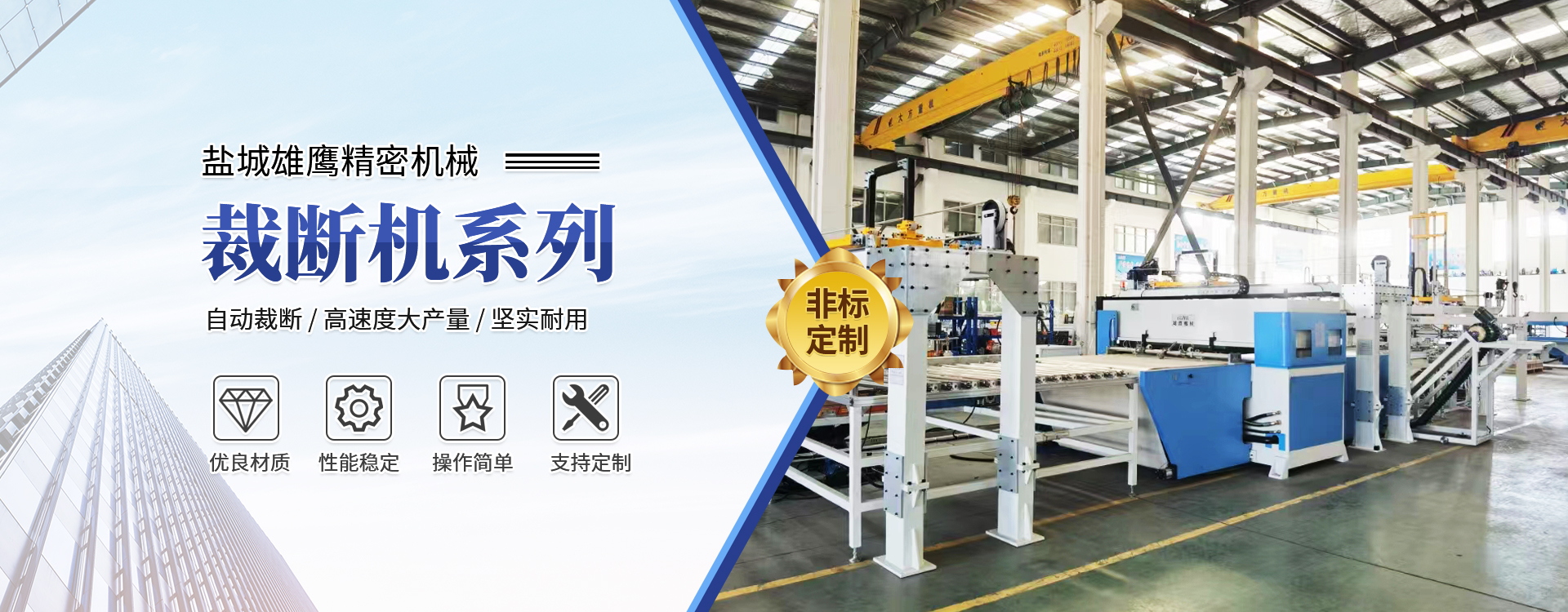 - 主營:"超鷹"牌液壓擺臂下料機、隨動式液壓擺臂下料機、液壓平面下料機、液壓龍門下料機、(旋轉(zhuǎn)頭)自動送料精密四柱液壓龍門下料機、四柱(精密四柱)液壓平面下料機、上壓板自動后移精密四柱液壓平面下料機等系列產(chǎn)品。